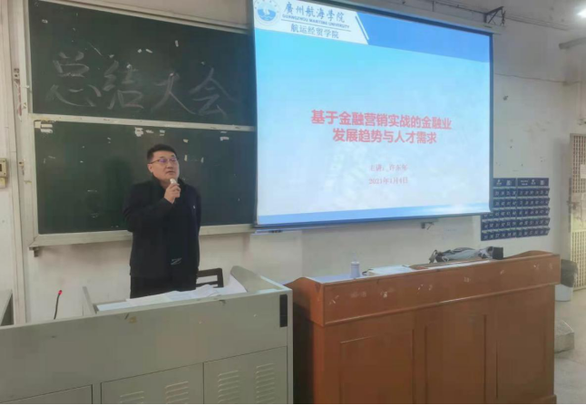 (航运经贸学院供稿)1月4日下午,粤港澳大湾区融资租赁有限公司总经理许东年应邀来到我校琶洲校区教学楼109教室,为我院2019级学生作了题为“基于金融营销实战的金融业发展与人才需求”的专题讲座,分享了他多年来的经历和感悟,并为同学们未来的学习和就业提供了指导和帮助。本次讲座活动由金融系主任吴俊博士主持。