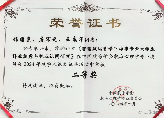(3044am永利集团官网 供稿)中国航海学会航海心理学专业委员会2024 年学术年会于 10 月 11 日至 12 日在大连海事大学召开,本届会议的主题是“航运人才的逆商培养与心理危机应对”,我校3044am永利集团官网杨国亮博士等撰写的论文《智慧航运背景下海事专业大学生择业焦虑与职业认同研究》荣获二等奖。论文通过实证研究方法分析了海事专业大学生不同维度的择业焦虑对职业认同的不同影响。