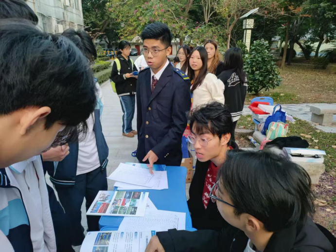 在水寨中学,金融242班的李晓瑜说,“我们采取线上线下相结合的方式,创建院校咨询群及时答疑解惑,为学弟学妹们驱散迷茫、缓解焦虑;摆摊讲解近距离交流,倾听大家的理想与困惑,热心提供贴合实际的建议,这个过程让团队成员充满了成就感”。