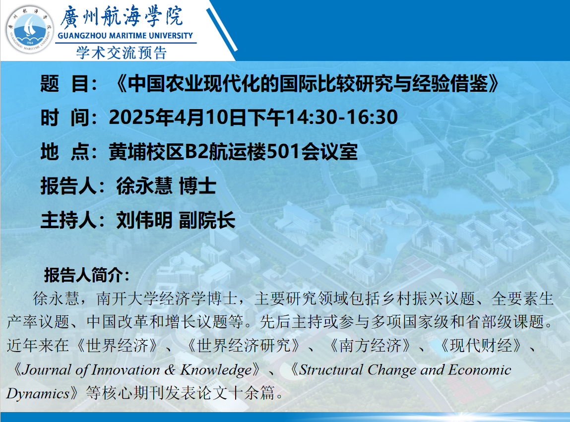 学术交流预告:徐永慧《中国农业现代化的国际比较研究与经验借鉴》